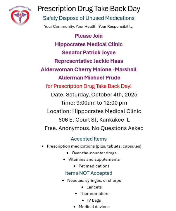 Safely dispose of your unused or expired medications at our upcoming Prescription Drug Take Back Day event on Saturday, October 4th! Stop by Hippocrates Medical Center in Kankakee from 9:00…